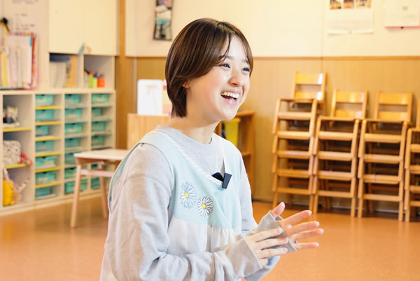 - 保育士になるのは小学生の頃からの夢でした。4年目で初めて年長クラスの担任になりました。もうすぐ卒園ですが、保育園最後の先生が私で良ったと言ってもらえるようにしたいです。