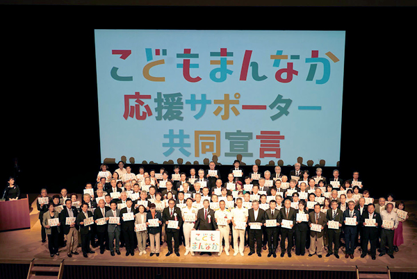 「こどもまんなか応援サポーター」の呉市長とともに「こどもまんなか」の趣旨に賛同し、「こどもまんなか応援サポーター」に就任した100人を超える企業、事業者、各種団体代表などで「こどもまんなか応援サポーター共同宣言」を行いました。